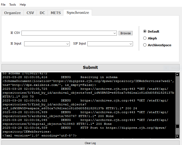 The Synchronize tab will synchronize an IE or set of IEs with either Aleph or ArchivesSpace. If the SIP is put together with a MARCXML file exported from Aleph, then each IE from the SIP should automatically contain an Aleph ID. Similarly, if the SIP is put together using an EAD exported from ArchivesSpace, then each IE from the SIP should automatically contain an Archival Object ID.